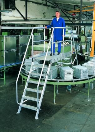 For the product in generalHeight of guardrails = 1100 mmDistance between rails = min. 500 mmHeight of toeboard = min. 100 mmDistance between posts = max. 1500 mmGuardrail units are compulsory for platformheights of over 500 mm.Standard step width = 600 mm - 800 or 1000 mm(with extension possible up to 3000 mm)Maximum load allowed on steps = 150 kgMaximum distributed load = 200 kg/m2